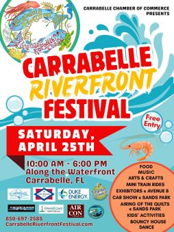 The Carrabelle Riverfront Festival is hosted by the Carrabelle Chamber of Commerce, funded in part by the Franklin County Tourist Development Council and sponsored by Centennial Bank, Duke Energy, Air-Con of Wakulla, Emerald Coast Federal Credit Union, Angler’s Edge Marine, and C-Quarters Marina. For details, check out www.CarrabelleRiverfrontFestival.com or contact 850-697-2585 or chamber@nettally.com.