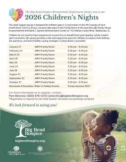 This grief support group is designed for children ages 6-12 and meets on the 4th Tuesday of each month from 5:30 to 6:30 p.m. Sessions take place in the Family Room at the Jean McCully Family House, located behind the Elaine C. Bartelt Administration Center at 1723 Mahan Center Blvd., Tallahassee, FL.
