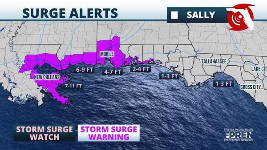 Storm Surge Warnings are in effect from the Okaloosa/Walton county line and westward. The official forecast from the National Hurricane Center is projecting surge of 2 to 4 feet of water above normally dry ground, particularly in northern Escambia Bay near the Escambia and White Rivers; in Blackwater Bay near the Yellow and Weaver Rivers; and near the Blackwater River in Santa Rosa county. Other areas of surge are likely along the barrier islands in places from Perdido Key to Pensacola Beach to Santa Rosa and Okaloosa islands. Peak surges of 1 to 3 feet are possible eastward toward Panama City, Apalachee Bay, and the Big Bend coastline. High surf and dangerous rip currents are expected to pose a danger to swimmers, as well.
