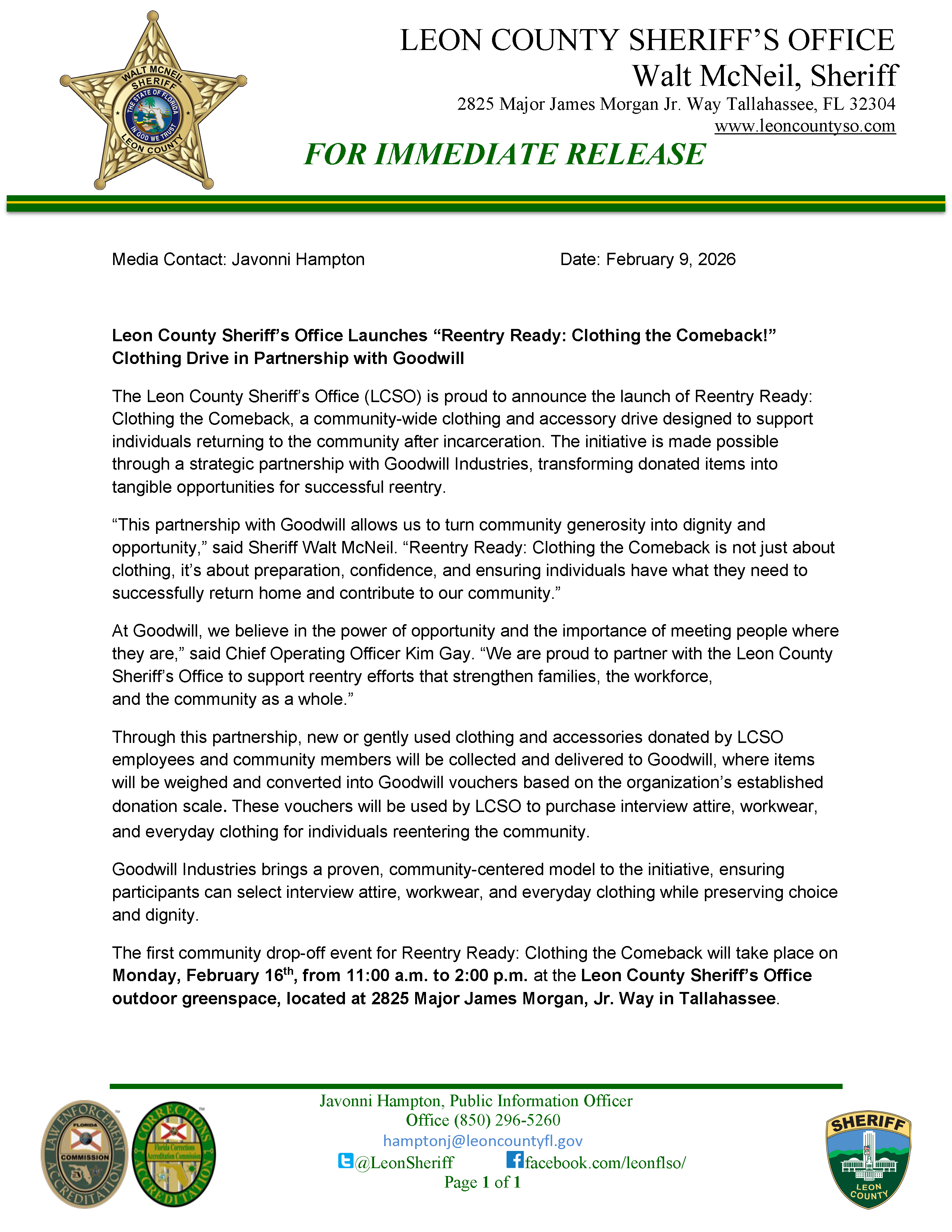 The Leon County Sheriff’s Office is proud to launch Reentry Ready: Clothing the Comeback, a community clothing and accessory drive supporting individuals returning home after incarceration.